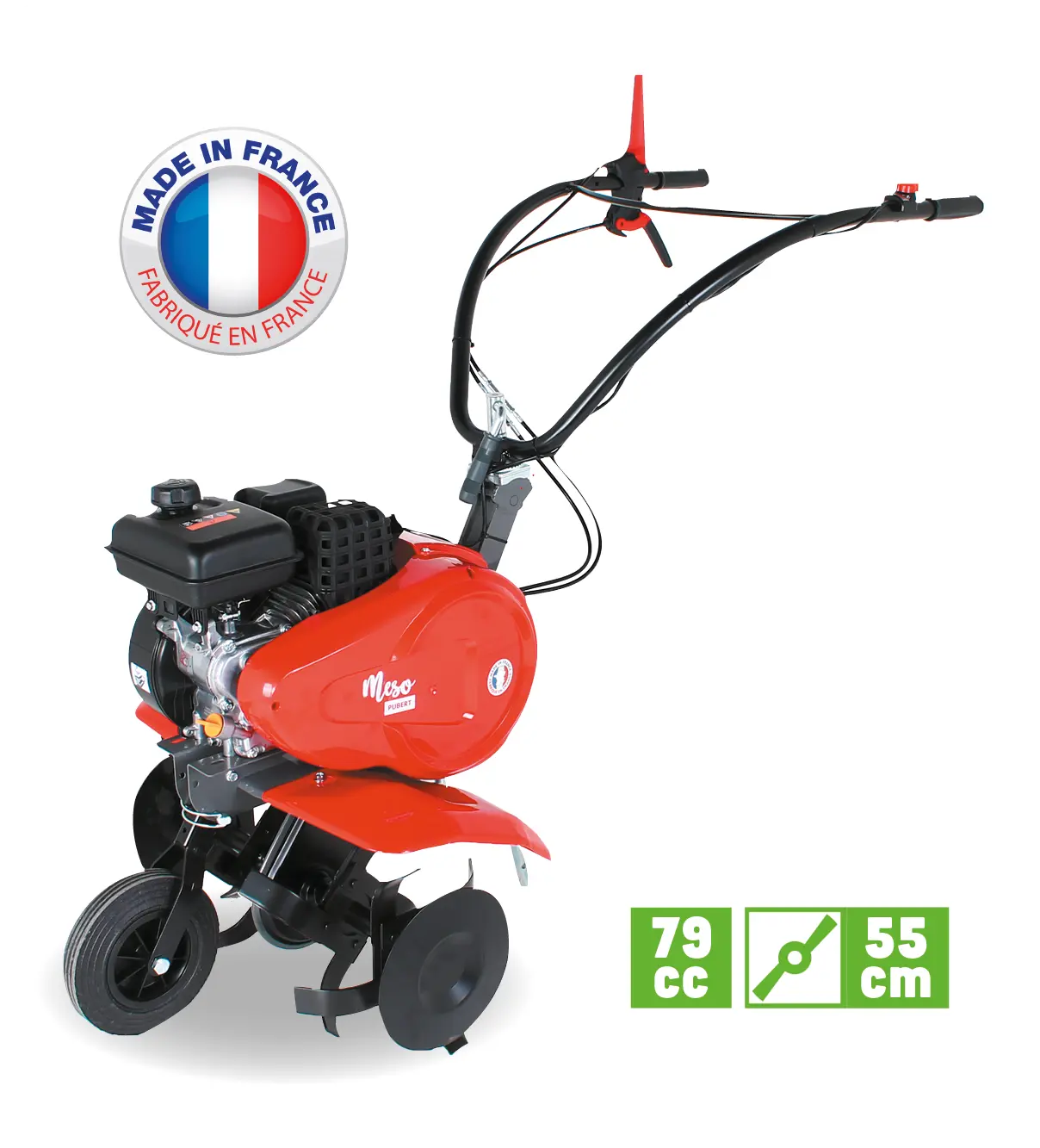 Moteur R80S, marche AV et AR, 4 fraises, disques, largeur de travail 55 cm, roue de transport, guidon réglable